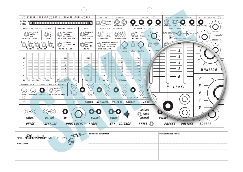 The Buchla 200 modules underwent a slight change of design in the mid-seventies, adding new knobs and introducing some new modules. A complete range of modules across the entire catalogue is available, so please email me with your configuration and I'd be happy to put together a patch sheet for your system.