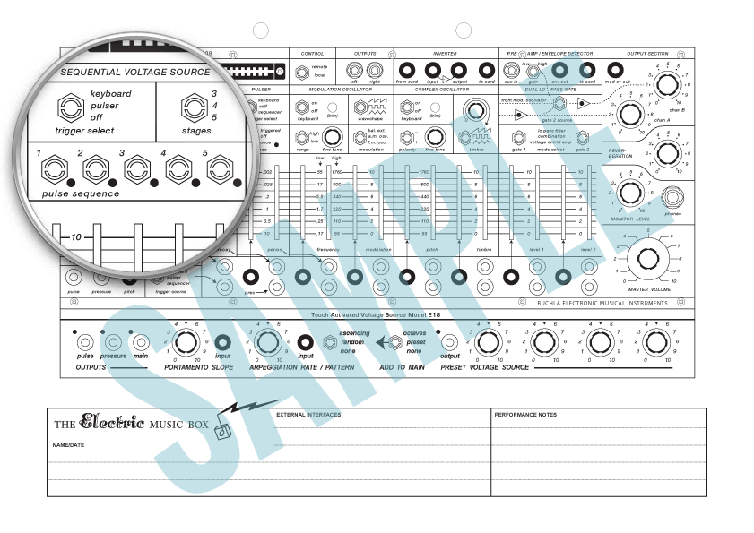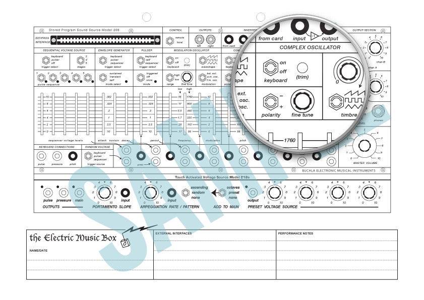 Here are patch sheets for both the original Music Easel from 1973, and the newer Easel. For the newer Easel, you can choose one with either the 218 or 218e touch controller. The only difference between the two is the logo.