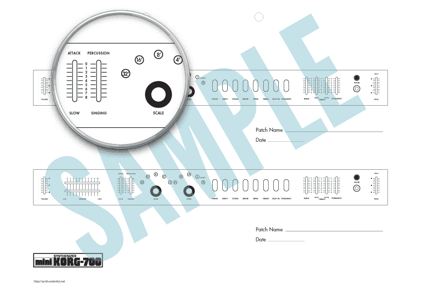 Korg's early "mini" monosynth, both the original 700 and the later 700S. The patch sheet for the 700 includes room for recording two patches on the one sheet.