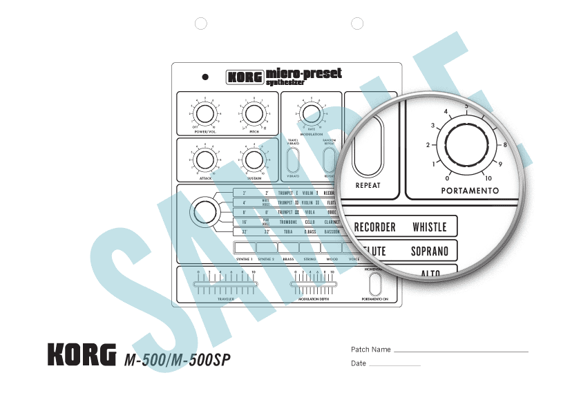 The "micro-preset" was originally released as the M-500 in 1977. A later version, the M-500SP had a small in-built speaker. Since the differences in the panels were only cosmetic (the sections on the SP had filled colours while the standard model had white outlines), one patch sheet here suits both models.
