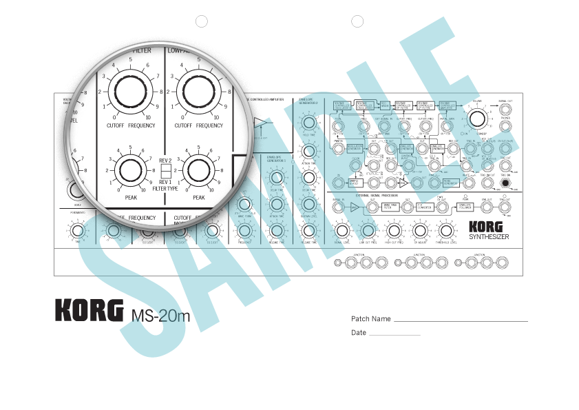 Korg briefly reissued the legendary MS-20 as a build-your-own desktop module. With additional patch points for V/Oct CV as well as the Korg standard Hz/V, and switches to choose filter type, oscillator sync, and frequency modulation, the MS-20m was a beast that is arguably better than the original. A limited production run means these are now hard to get hold of, and command prices equal to or exceeding their vintage progenitors. If you're lucky enough to own one, here's a patch sheet for you.