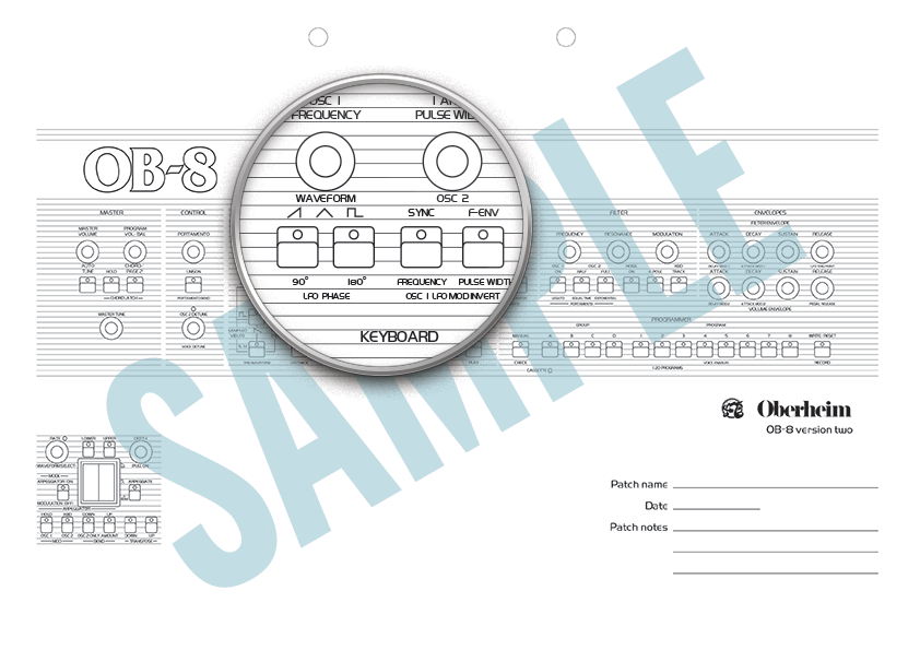 Patch sheets are available for both the single-manual and double-manual versions of Oberheim's massive and legendary eight-voice synthesizer. Choose the version that matches your instrument.